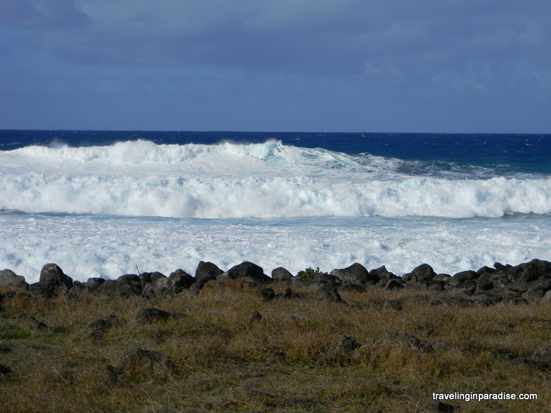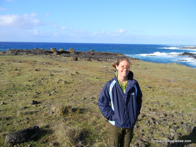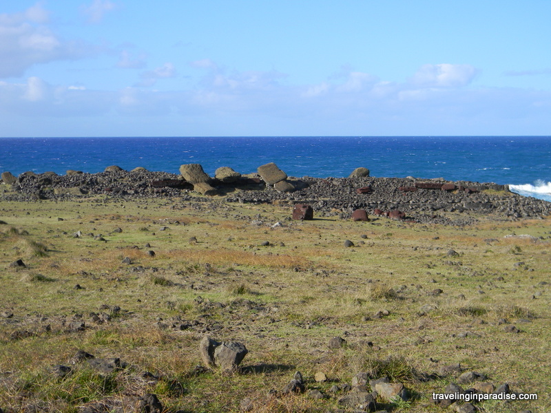 Towards the end of our trip, we rented a car with some people we met at the camp and decided to use our bandana map (a souvenir we purchased in Hanga Roa) to see the remaining ruins. Even though we did not go during the tourist season there was still a little “market” where the locals sold souvenirs at the entrance to the ruin. Unlike my earlier post about Ahu Tongariki, the moai here are toppled over and were left in a dilapidating state, however, this added another layer of beauty to the ruins. This was the first ruin we encountered where there were other people, we weren’t sure the boundaries of this particular ruin since we didn’t see any signs indicating not to pass this point. We assumed incorrectly that we couldn’t go near the ruins since there weren’t any people near them, you can go by these ruins and on the other side of them you will find another toppled over moai and an unusually small moai. The first thing we came across when we came upon this ruin was the remains of the ancient village that was here. You can see all that is left of the hare vaka or boat houses.