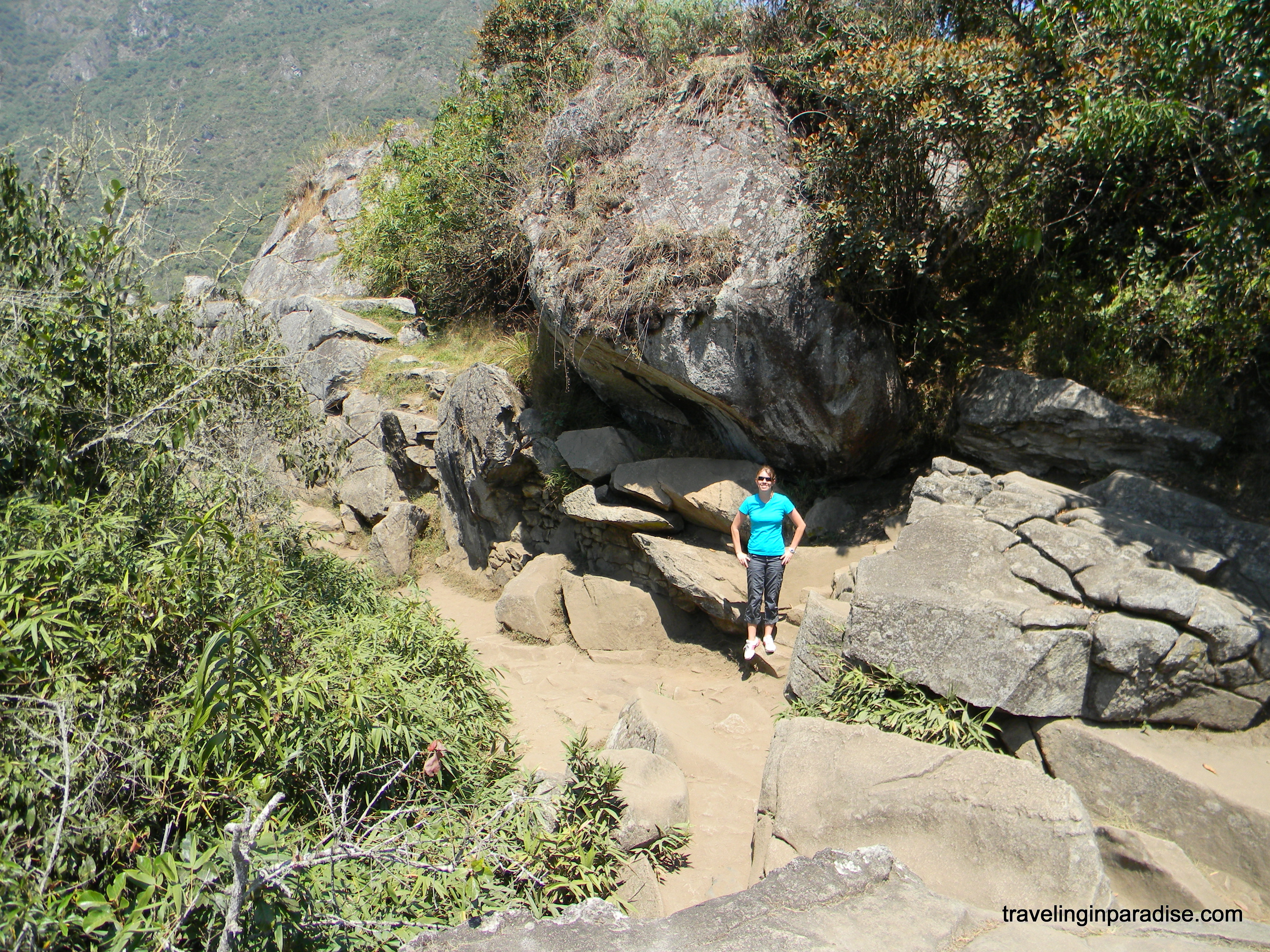 At the top of the hill you can walk down to the ruins of Machu Picchu or follow the Inka Bridge Trail. At the beginning of the trail to the Inka Bridge you have to write your name, age, country, and id or passport number in a book. This is because the trail is pretty narrow and there is a five or six hundred feet cliff drop off.