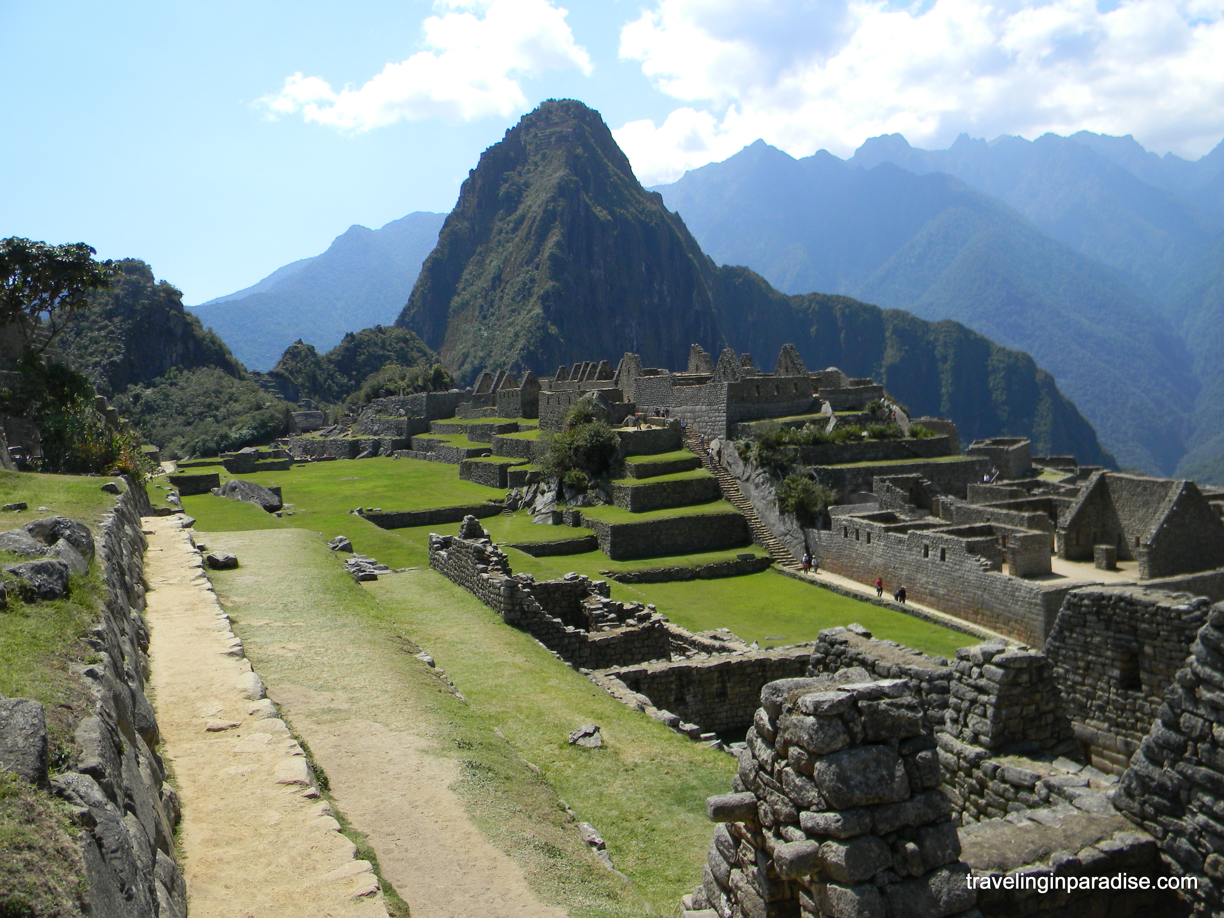 We only had a few days in Peru so we took the train instead of hiking the Inca Trail. We took the first train from Poroy which left at 6:45 am and we had to arrive thirty minutes early. Poroy is a small town about twenty minutes by taxi from Cusco. The train ride was a little slow it took roughly three hours and cost about $80 a person, but they did serve us a meal on the train. The return train ride was about $60 a person and took closer to four and a half hours. The train ride starts in Poroy takes you through Sacred Valley and ends in Aguas Calientes. During the train ride you will notice the closer you get to Machu Picchu the cleaner the air gets, the river widens and becomes more clear, the vegetation becomes a lush jungle with mountains soaring into the sky. In Aguas Callientes we had to pay $31 for two round trip tickets to Machu Picchu. The bus ride took twenty minutes and went up an incredibly steep narrow roads full of switchbacks. Bring a soda and some gum, both help with altitude sickness and helping you adjust to the higher altitude. On the road you can see a few ruins believed to be where they had their crops. Once you get off the bus it is a short walk to the entrance of Machu Picchu then another brief walk up a hill that goes to the part of the mountain that will lead you to the overlook that looks over Machu Picchu. The view is breath-taking. You aren’t able to see any of Machu Picchu until you are on top of the hill. The above photo is your first view of Machu Picchu and the best view you can get, we recommend when you go, go up the hill so this is your first sight of Machu Picchu it is more spectacular to see the ruins all at once and looking down onto it. ![]()